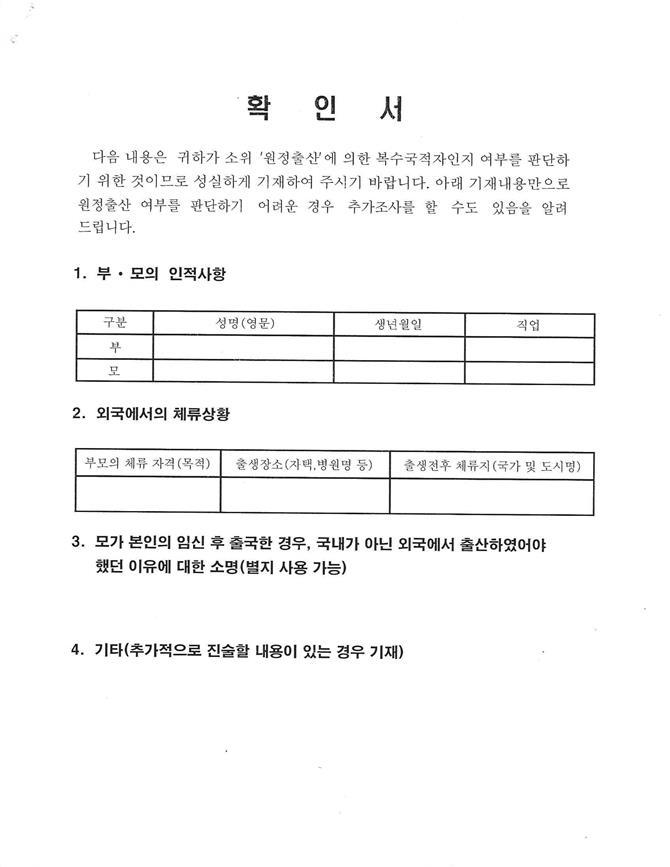 원정출산에 의한 복수국적자 확인서 양식은 우측 상단의 첨부서류 아이콘을 누르시면 기입용지가 나옵니다.